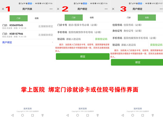 3、在“个人中心(用户绑定)”进行就诊卡或住院号绑定。绑定成功后即可进行上图所示的各类充值或查询动作。(注部分外送检验检查无法查询)