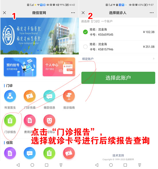 4、选择“门诊报告”或“住院报告”,选择就诊人,进行后续报告查询动作。