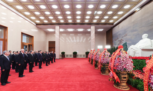 12月26日,中共中央在北京人民大会堂举行纪念毛泽东同志诞辰130周年座谈会。座谈会前,习近平、李强、赵乐际、王沪宁、蔡奇、丁薛祥、李希、韩正等领导同志来到毛主席纪念堂瞻仰毛泽东同志遗容。新华社记者 鞠鹏 摄