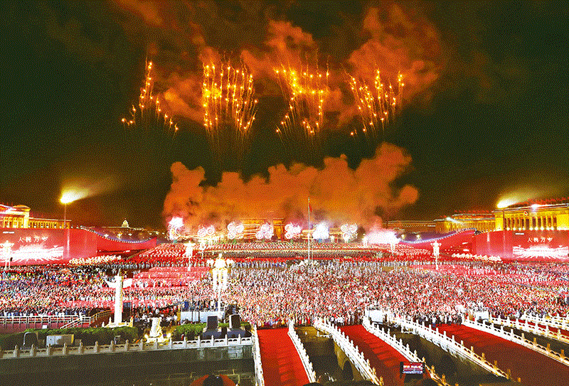 2019年10月1日晚,庆祝中华人民共和国成立70周年联欢活动在北京天安门广场盛大举行。图为绚丽烟花排列出了“人民万岁”的字样。