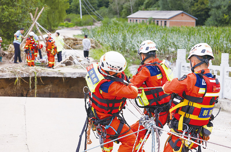 2023年夏,面对影响华北、黄淮、东北等地的严重汛情,在以习近平同志为核心的党中央坚强领导下,广大党员干部为守护人民生命和财产安全挺身向前,千千万万人民群众为保卫家园顽强奋战。图为8月6日,吉林省吉林市消防救援支队队员利用绳桥解救受困村民。