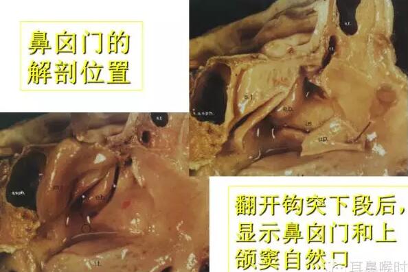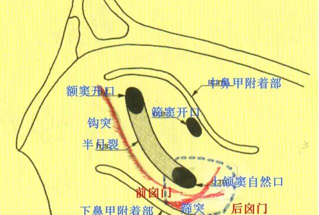 以筛漏斗为中心的邻近区域结构,包括:中鼻甲 钩突 半月裂 前筛 上颌窦自然口 鼻囟门