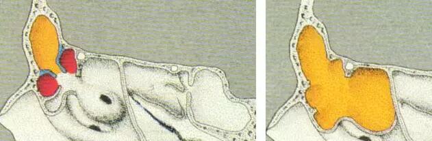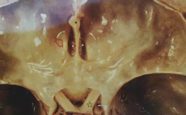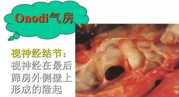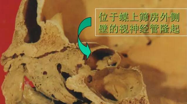 发育良好的最后筛房外侧壁上可能出现两个隆起,两者呈开放的“八”字型排列,视神经结节居前上,颈内动脉隆起位于后下。