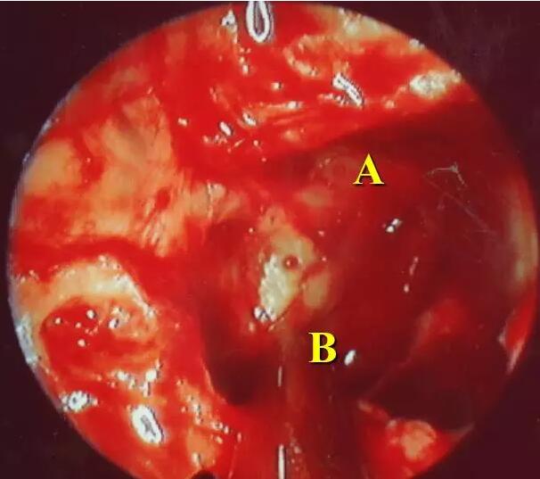 蝶窦内管型视神经管(A.视神经管 B. 颈内动脉)