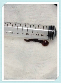 手术过程:患者取仰卧位,常规消毒铺巾,予含有1%丁卡因溶液的棉片自右侧总鼻道放入堵塞后鼻孔,1%丁卡因溶液约5ml灌入右鼻腔予表麻鼻腔异物约5分钟,止血钳钳取出异物,见异物为一细长形动物,头端见圆形底盘,长约6cm,可活动,符合水蛭。手术过程顺利,术中无明显出血,再次检查双侧鼻腔、鼻咽部未见明显异常。