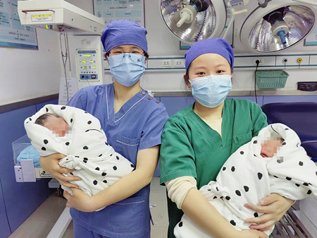 2023年2月21日09:04分一声嘹亮的啼哭声从手术室飘出打破了宁静,09:06分又一声银铃般的啼哭声再次飘出,手术室外等候的家属按捺不住激动的心情冲到门前,不一会门打开,两医护满脸含笑怀抱龙凤双胎婴儿出来,看着缩在怀里的小生命,家属们终于落下了心中的担忧,露出了欣慰的笑脸。