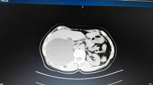 门诊检查,查超彩(上腹部):肝内巨大囊性占位,考虑囊肿;胆、胰、脾、双肾未见明显异常声像。