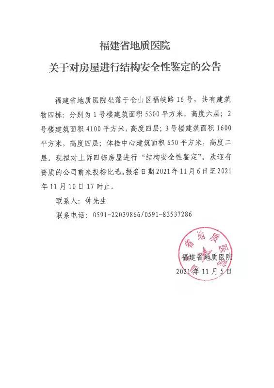 福建省地质医院关于对房屋进行结构安全性鉴定的公告