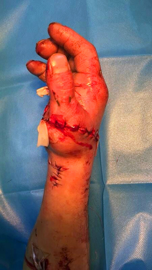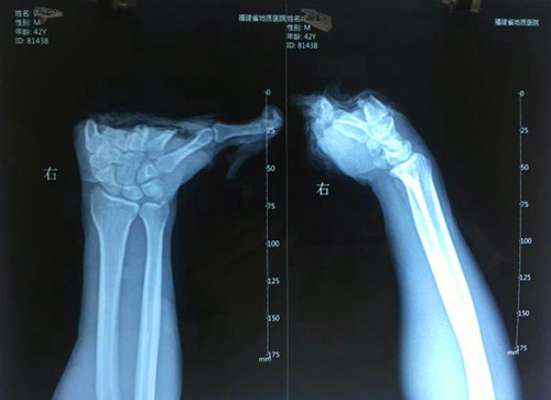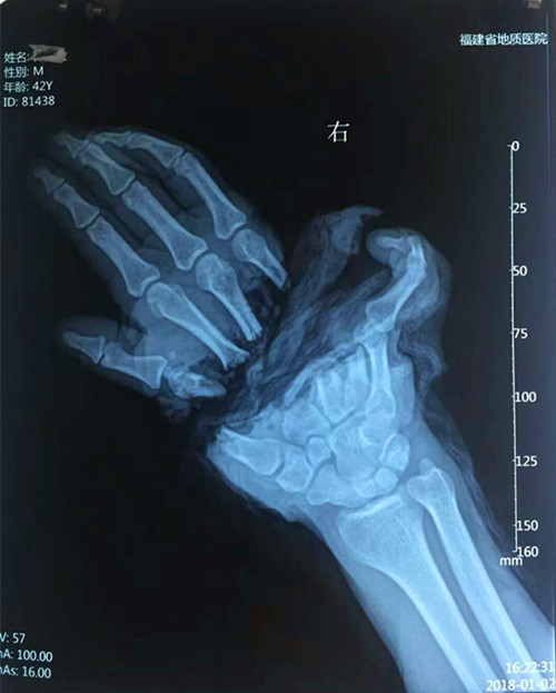 患者,许某某,男性,42岁,长乐某工厂职工,因在做工时被机器绞伤,右手掌完全离断。经诊断分析:手部掌骨粉碎,血管、神经、肌腱、肌肉、皮肤绞烂撕脱,伤情严重,再植难度大,手术时间长。